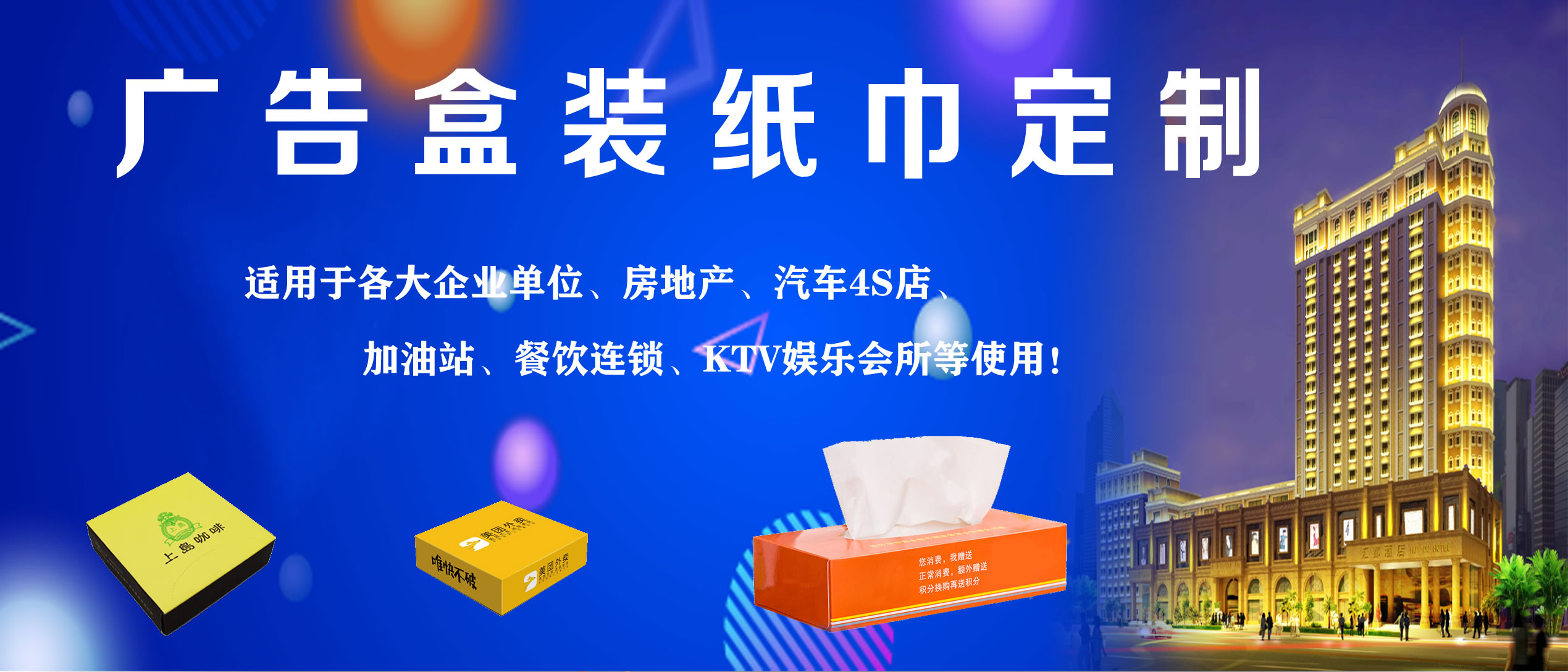 合肥億竹紙品包裝有限公司是一家專業(yè)從事各種生活用品定制的企業(yè),定制熱線:18919603840(周經(jīng)理)。公司與各大餐飲行業(yè)、酒店、加油站、學校、KTV娛樂會所、銀行、汽車4S店、房地產(chǎn)、廣告公司等客戶長期合作,業(yè)務(wù)覆蓋安徽全省。公司主營產(chǎn)品:廣告盒抽定制、餐巾紙定制、大盤紙、擦手紙、散抽紙等。有著完善的生產(chǎn)硬件設(shè)備和專業(yè)技術(shù),及長期從事的豐富經(jīng)驗。 我廠專注生活用品多年,致力于生產(chǎn)“精致,高端,綠色,健康”于一體的優(yōu)質(zhì)產(chǎn)品,以誠信、實力和產(chǎn)品質(zhì)量獲得業(yè)界的認可。目前我廠產(chǎn)品已深得寶馬汽車、重慶劉一手火鍋餐飲連鎖、萬達集團、綠地集團等眾多客戶的青睞,業(yè)務(wù)量不斷攀升。